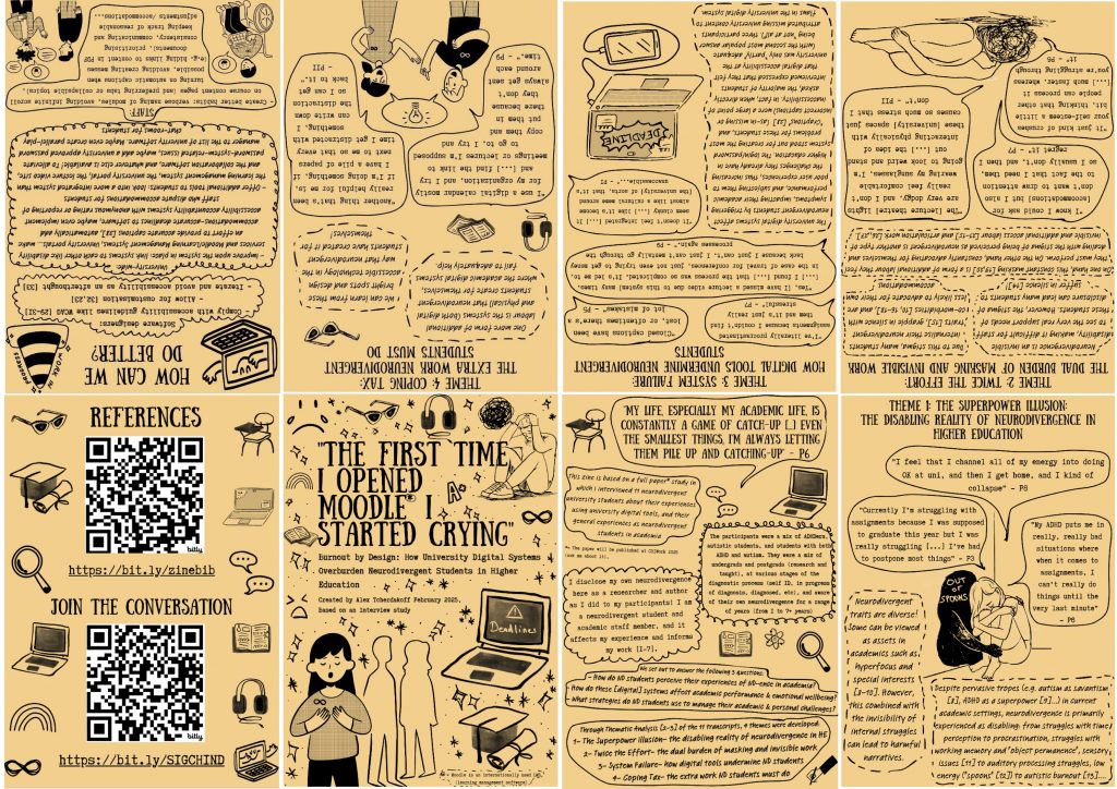 The session will employ participatory methods like show-and-tell, small-group dialogues, and zine co-creation, facilitating self-expression, critical reflection, and community-building (Kara, 2015; Taylor & Robinson, 2009). I will use the below zine (displayed in fig. 1) – (NEED to ASK PERMISSION TO ALEX) and anecdotes from personal experience (as recently exploring the possibility of having ADHD and having worked for many years with neurodiverse children, students and colleagues) as an ice-breaker to spark further discussions among students on the three topics of conversation.